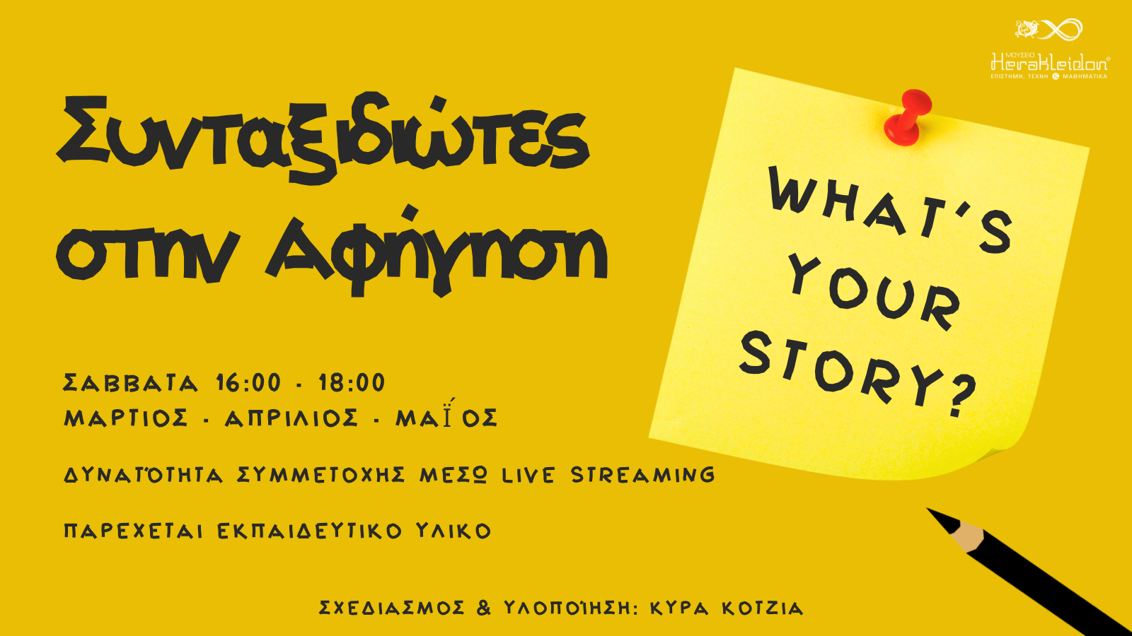 Θέλετε να αφηγείστε καλύτερα — και να γράφετε ιστορίες που κρατούν το ενδιαφέρον; Ελάτε στους «Συνταξιδιώτες στην Αφήγηση», το νέο πρόγραμμα του Μουσείου Ηρακλειδών, και γίνετε μέρος μιας ομάδας ενηλίκων που μοιράζεται την αγάπη για τη λογοτεχνία, την επιστήμη και τη γραφή.