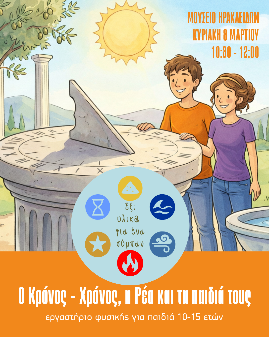 Τι κοινό έχουν ο Ποσειδώνας, ο Προμηθέας, η Γαία, ο Αίολος, ο Κρόνος και τα αστέρια; Όλοι τους κρύβουν μέσα τους φυσικά φαινόμενα! Στο νέο διαδραστικό εργαστήριο του Μουσείου Ηρακλειδών, η φιλοσοφία του Αριστοτέλη γίνεται οδηγός για να γνωρίσουν τα παιδιά τα τέσσερα θεμελιώδη σύν δύο επιπλέον υλικά με τα οποία φτιάχτηκε ο κόσμος.