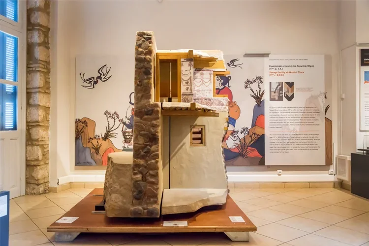 Στο Ακρωτήρι και, συγκεκριμένα, στη Δυτική Οικία, στον πάνω όροφο της οποίας βρέθηκε σε εξαιρετική κατάσταση, ένα «σχεδόν σύγχρονο αποχωρητήριο». Ο χώρος αυτός ήταν απομονωμένος από τα υπόλοιπα δωμάτια με έναν τοίχο από τούβλα και είναι ως επί το πλείστον όμοιος με τα σημερινά αποχωρητήρια. Βρίσκεται στη νοτιοδυτική γωνία της πτέρυγας στον όροφο και έχει διαστάσεις 1,30. x 1,95μ. Στον δυτικό τοίχο δημιουργείται εσοχή, πλάτους 1,05μ., ύψους 1,70μ. και βάθους 0,13μ. Στην εσοχή αυτή διαμορφώνονται δύο ορθογώνια πεζούλια που έχουν μορφή κτιστού θρανίου, από πέτρες πελεκητές και απελέκητες. Ασβεστοκονίαμα έχει χρησιμοποιηθεί ως επίχρισμα στα πεζούλια αυτά, τα οποία απέχουν από το δάπεδο 0,43μ. και έχουν βάθος 0,37μ. Ανάμεσα στα πεζούλια υπάρχει ένα κενό περίπου 0,8–0,9μ., στο βάθος του οποίου διαμορφώνεται οπή στο πάτωμα, η οποία συνδέεται με αγωγό που απαρτίζεται από κατακόρυφους, κυλινδρικούς, πήλινους σωλήνες. Το κάτω άκρο του αγωγού κατέληγε σε ένα άνοιγμα του τοίχου προς την εξωτερική πλευρά του κτηρίου, κοντά στα θεμέλια, και άδειαζε σε φρεάτιο το οποίο συνδεόταν με κεντρικό αγωγό κάτω από το δρόμο. Στο φρεάτιο βρέθηκε ένα είδος «σιφωνίου» από πλάκες που χρησίμευε στην επιτάχυνση της ροής των αποβλήτων και στον αποκλεισμό των δυσάρεστων οσμών έξω από το κτήριο. Στα συντρίμμια του πατώματος, το οποίο αποτελείτο από πέτρες και πατημένο χώμα, βρέθηκαν, μεταξύ άλλων, κομμάτια ενός πήλινου λουτήρα που πιθανώς βρισκόταν στο αριστερό τμήμα του «δωματίου». Η εγκατάσταση και, συνάμα, το κτήριο χρονολογούνται στον 17ο–16ο αι. π.Χ.