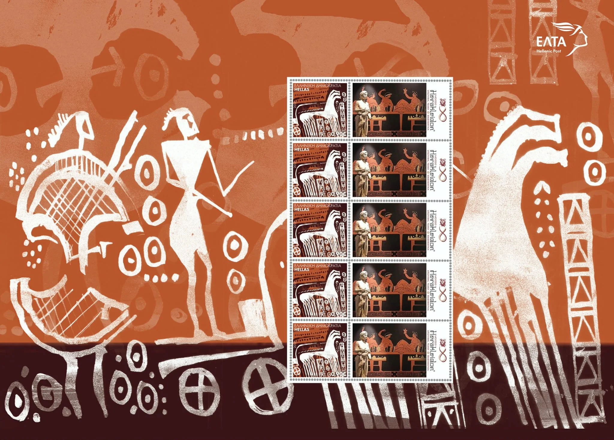 Η βινιέτα που χρησιμοποιήθηκε, προέρχεται από παλιό γραμματόσημο των ΕΛΤΑ και αποδόθηκε για αποκλειστική χρήση από το Μουσείο Ηρακλειδών. Το εικαστικό της βινιέτας βασίστηκε σε αττικό υστερογεωμετρικό κρατήρα που χρονολογείται γύρω στο 750-735 π.Χ. Είναι ένα μνημειώδες αγγείο που στην αρχαιότητα χρησιμοποιούνταν για την ανάμειξη κρασιού με νερό. Ωστόσο, το συγκεκριμένο, λόγω του μεγάλου μεγέθους του και της τρύπας στον πυθμένα του, λειτούργησε ως επιτύμβιο μνημείο σε τάφο αριστοκράτη στο νεκροταφείο του Κεραμεικού στην Αθήνα. Σήμερα, εκτίθεται στο Εθνικό Αρχαιολογικό Μουσείο της Αθήνας, ενώ υπάρχει κι ένα άλλο παρόμοιο έργο του ίδιου ζωγράφου στο Μητροπολιτικό Μουσείο Τέχνης της Νέας Υόρκης.
