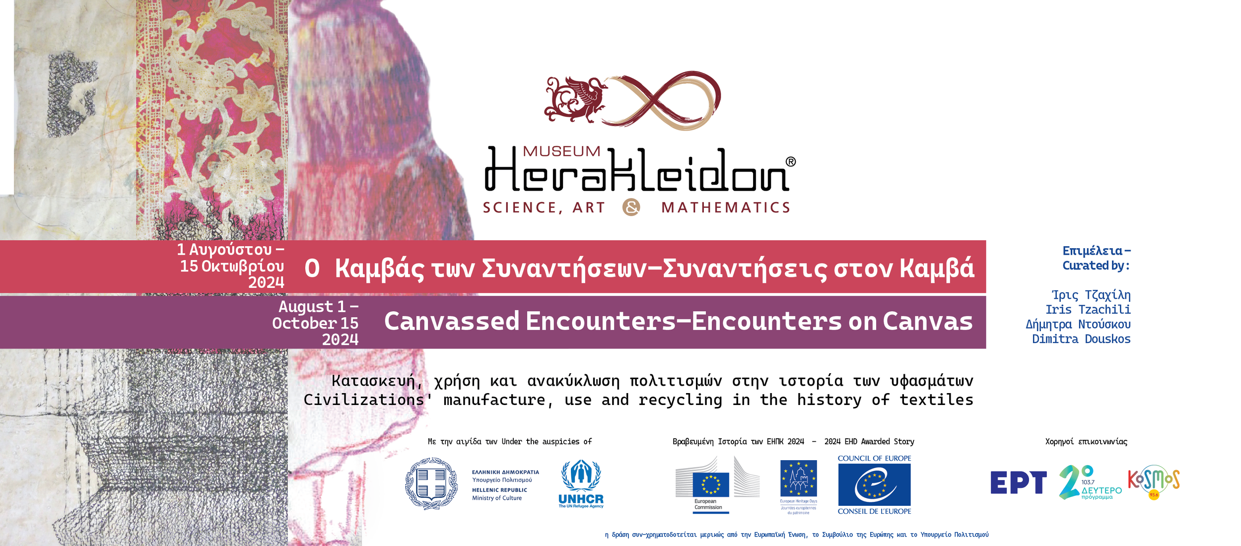 Η έκθεση Ο καμβάς των συναντήσεων - Συναντήσεις στον καμβά, η οποία εγκαινιάστηκε την 1η Αυγούστου και θα διαρκέσει μέχρι τις 15 Οκτωβρίου 2024, έχει θέμα την ύφανση και την ένδυση σε όλα τα στάδια της λειτουργικής αλυσίδας τους, δηλαδή σε όλα τα βήματα από την παραγωγή έως την χρήση και την ανακύκλωση των υφασμάτων. Η έκθεση αποτελείται από εγκαταστάσεις, πίνακες ζωγραφικής, τεχνικές προσομοιώσεις, αντίγραφα, πραγματικά υφάσματα και ανακατασκευές. Τα εκθέματα εμπίπτουν ασφαλώς στον ευρύτερο τομέα της ύφανσης και της ενδυμασίας αλλά και συναφών κύκλων όπως οι ποικίλες ανά τον κόσμο άυλες τεχνικές, οι υφάνσιμες ίνες, η γραφή, το εμπόριο, το φαινόμενο της μόδας, συμβολισμοί και αναπαραστάσεις.